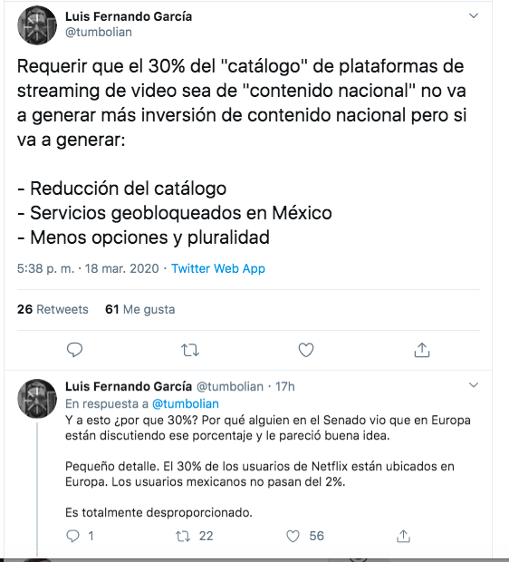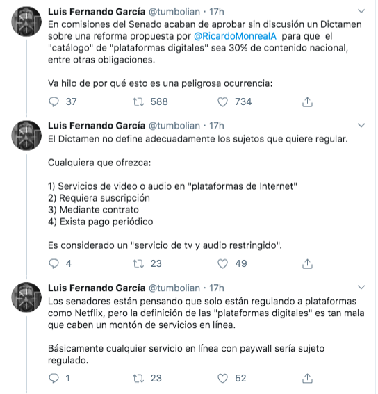 Luis Fernando García, director de la organización Red en defensa de los derechos digitales (R3D), también se pronunció contra la misma por los siguientes motivos que explicó en un hilo en Twitter: