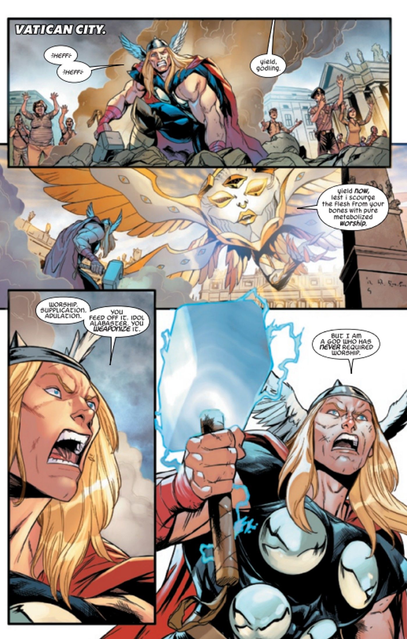 Vista previa de páginas para Vengadores #6, de Jed MacKay, Ivan Fiorelli, Federico Blee y Cory Petit de VC, encuentra a Thor protegiendo la Ciudad del Vaticano de una deidad rebelde. Durante su enfrentamiento, explica una diferencia clave entre él y el resto de los dioses de Marvel.