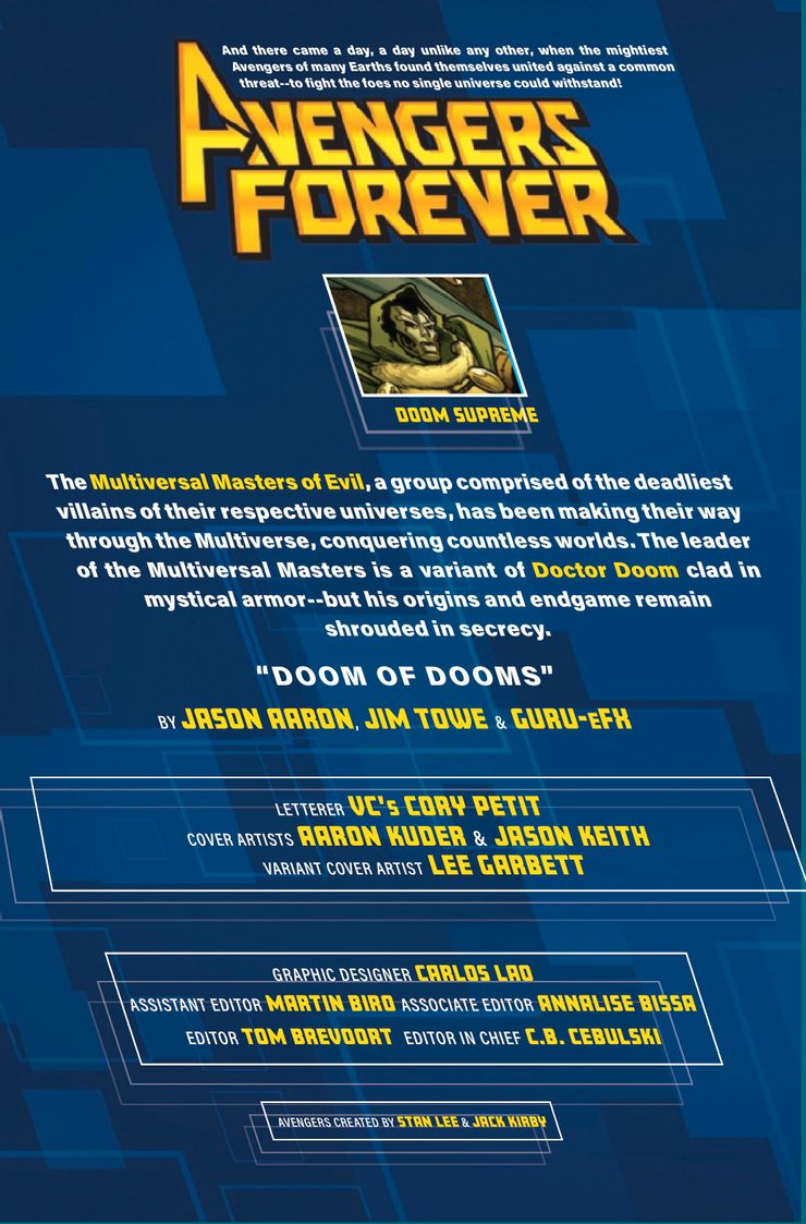 AVENGERS FOREVER #5- DOOM OF DOOMS¡EL DOOM DE TODOS LOS DOOMS! Todo lo que sabemos sobre el líder de los nuevos Multiversal Masters of Evil es que se hace llamar Doom Supreme y que universo tras universo sigue desmoronándose ante él. Pero en un multiverso lleno de versiones conquistadoras del mundo de Victor Von Doom, ¿qué hace que este sea el Doom sobre todo?