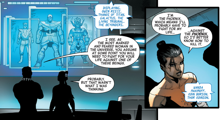 La inclusión de Thanos es más cuestionable, en parte porque sus poderes tienden a fluctuar de una historia a otra, aunque está respaldado por el hecho de que ha sobrevivido al combate con anfitriones anteriores de Phoenix, como su hijo Thane. Es probable que la Fuerza Fénix sea tan (si no más) capaz de matar al Titán Loco como viceversa, pero el increíble poder de Thanos siempre se combina con su intelecto genial, igualando el conflicto sugerido. Scarlet Witch será una inclusión particularmente sorprendente para los fanáticos, aunque su papel en Vengadores contra X-Men dejó en claro que Chaos Magic tiene un poder particular sobre Phoenix Force. Finalmente, los lectores ocasionales pueden sorprenderse al encontrar a Thor en la lista, pero vale la pena tener en cuenta que recientemente experimentó una gran mejora después de matar a Galactus; es posible que esta sea la razón por la que está en la lista, aunque vale la pena señalar que su victoria sobre Galactus puede significar que es capaz de esta hazaña con sus poderes regulares.