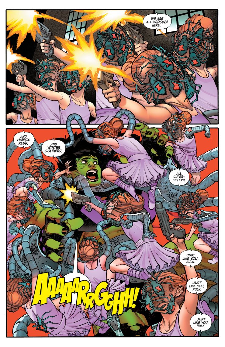 En el nuevo Vengadores # 47, El Capitán América y Iron Man sirvieron como equipo de tierra para tratar de rescatar a She-Hulk, pero fueron rápidamente interceptados por Crimson Dynamo y Vanguard (el nuevo reemplazo de Red Guardian). Esto luego lleva a que el Capitán Marvel y Thor entren como apoyo aéreo, pero la corrupción de She-Hulk ya se había afianzado. Si bien She-Hulk tuvo la visión de liberarse de sus ataduras en la Habitación Roja, se encontró con un grupo de bailarinas, no muy diferente a las que se ven en Black Widow’s. Edad de Ultron visión. Sin embargo, estas bailarinas son mucho más inquietantes y, en conjunto, más horripilantes.