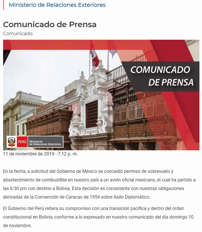 En la página de internet de la dependencia peruana se informó: “en la fecha, a solicitud del Gobierno de México se concedió permiso de sobrevuelo y abastecimiento de combustible en nuestro país a un avión oficial mexicano, el cual ha partido a las 6:30 pm con destino a Bolivia. Esta decisión es consistente con nuestras obligaciones derivadas de la Convención de Caracas de 1954 sobre Asilo Diplomático”.