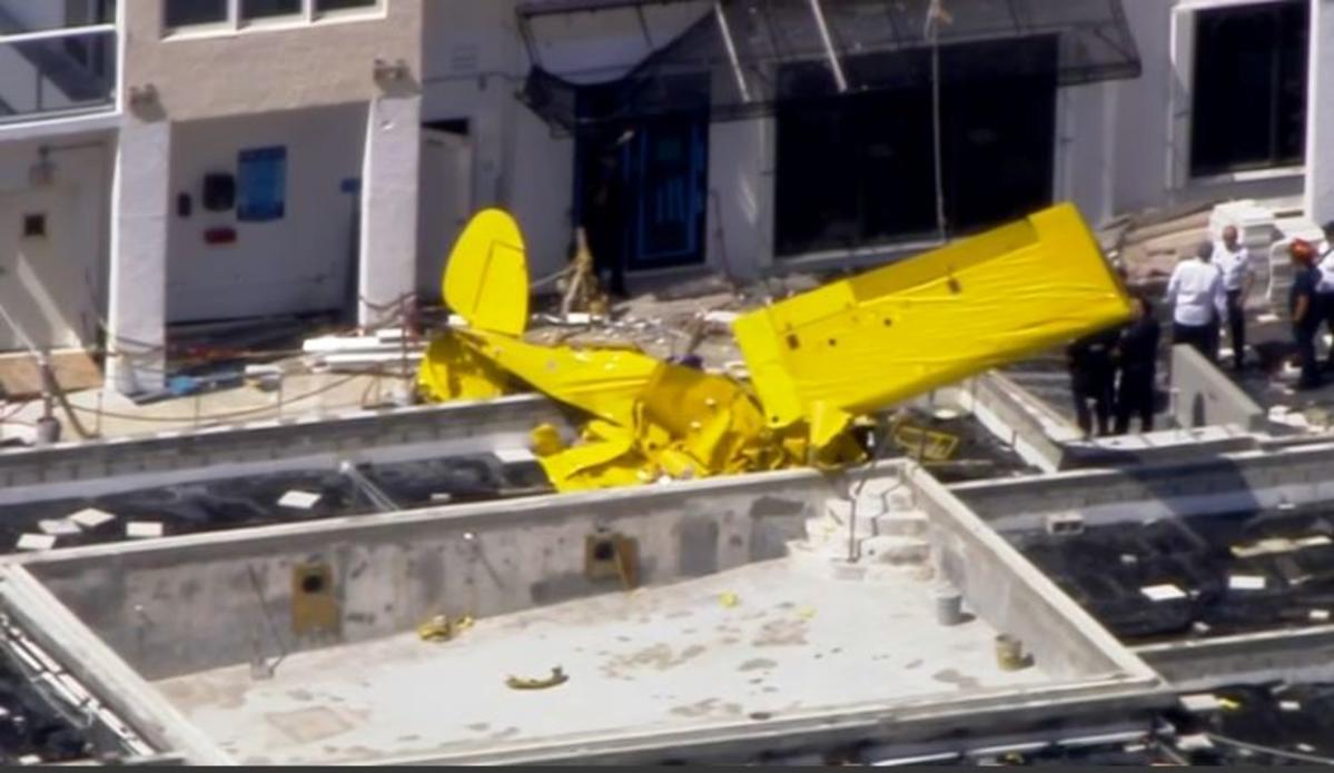 Al parecer, la pequeña avioneta se estrelló contra uno de los pisos superiores del complejo de apartamentos y luego cayó sobre el techo de la recepción y cerca a la piscina en construcción.