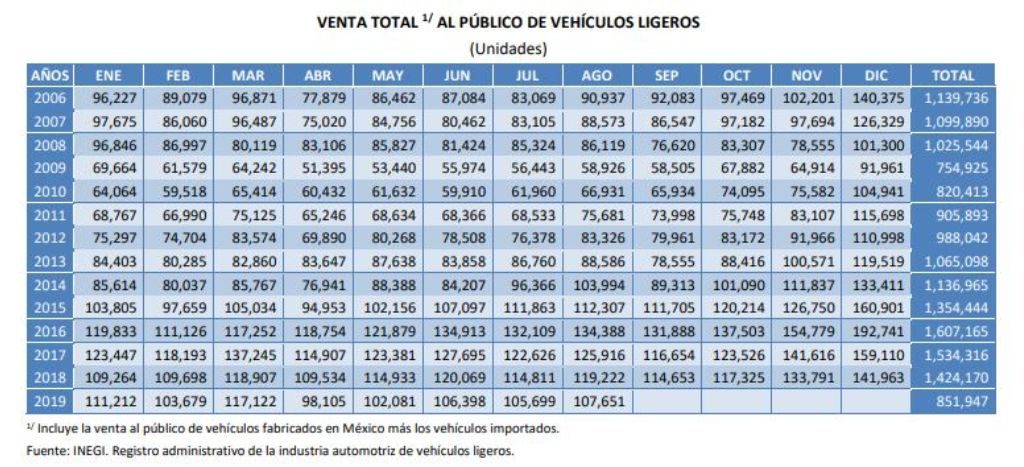 El Inegi reportó que de enero a agosto de 2019, se han vendido 851 mil 947 unidades, de acuerdo con cifras de las 21 empresas afiliadas a la Asociación Mexicana de la Industria Automotriz.