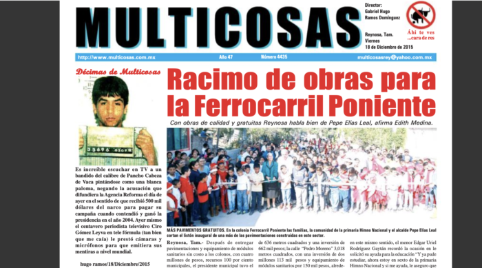 “Hay una foto donde Cabeza de Vaca fue detenido siendo adolescente en Estados Unidos por robo a mano armada, él con otros 2 sujetos que también después uno de ellos estuvo vinculado con la delincuencia organizada y luego lo mataron, ahí viene en la investigación, él era un pandillero juvenil, quien saca esa foto cuando (García Cabeza de Vaca) iba a ser alcalde de Reynosa… el periodista Hugo Ramos saca la foto en su periódico Multicosas y frente a su casa explota un auto… y lo amenazaron de muerte, que se fuera porque lo iban a matar, hoy vive en Estados Unidos, es un hombre muy valiente, mayor, pero él se tuvo que salir”, detalló.