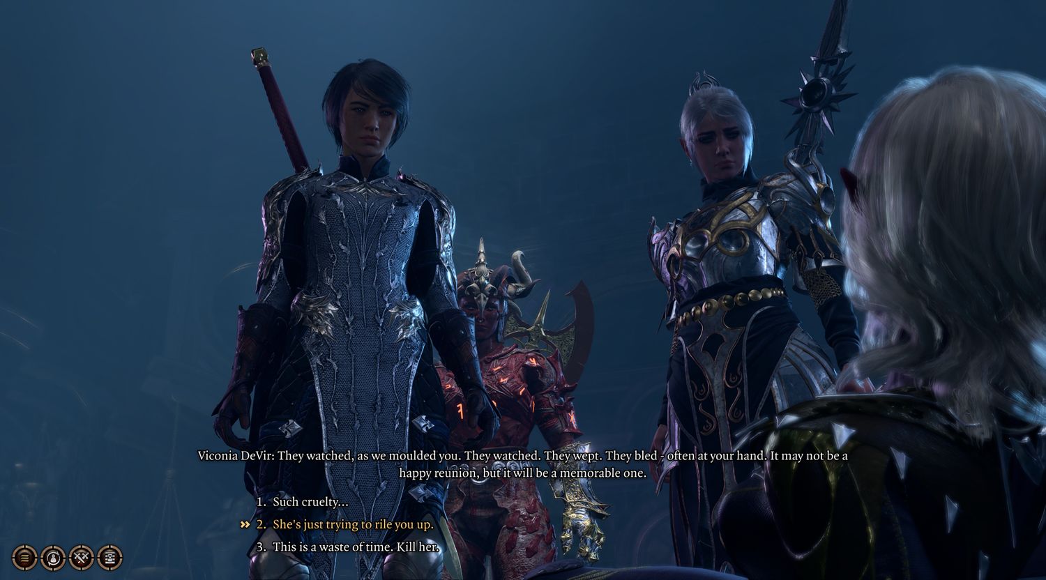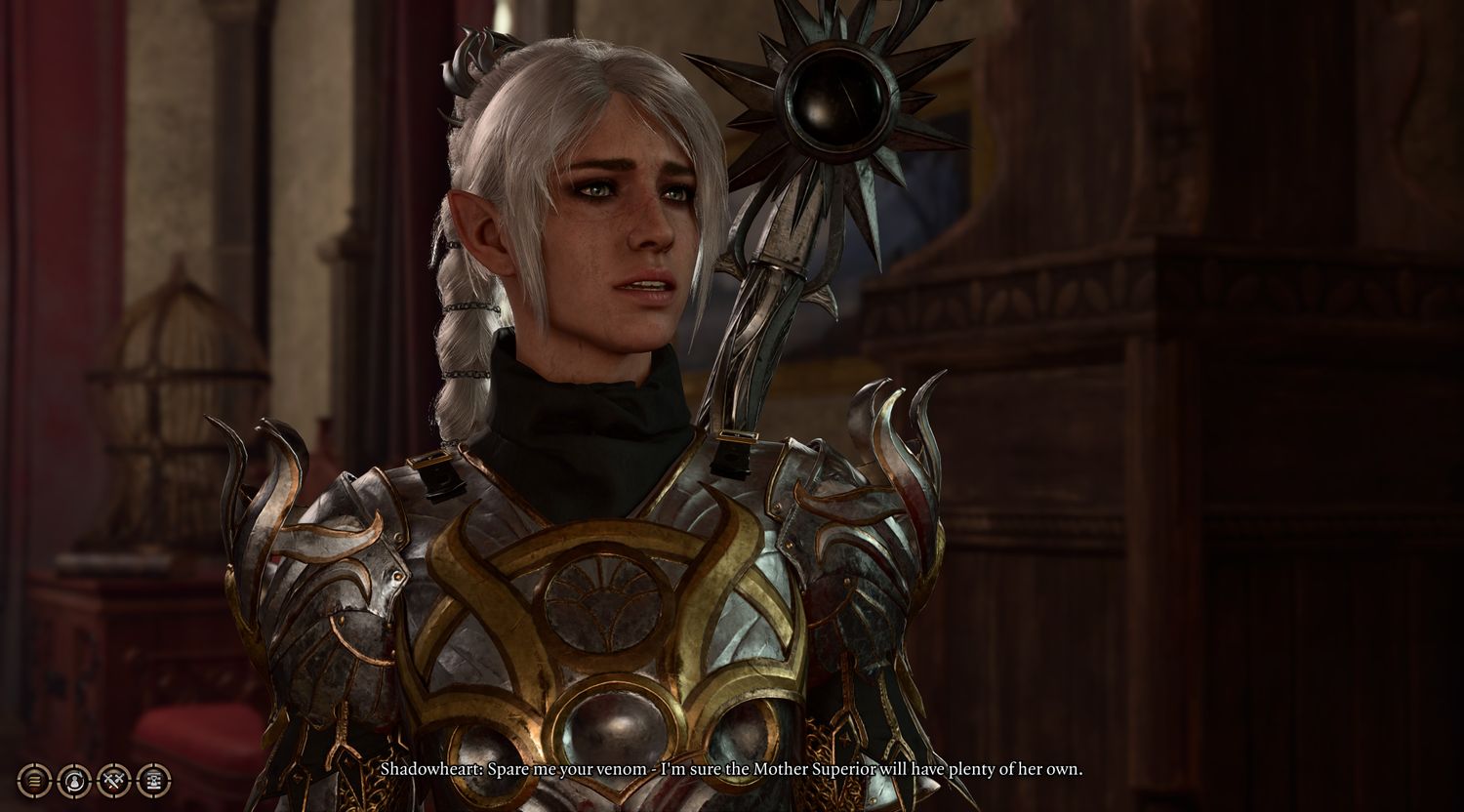 Aparecerá una figura extraña y regañará a Shadowheart por su traición. Se revela que ella está hablando con una proyección de Viconia de VirMadre Superiora de los Discípulos de Shar.