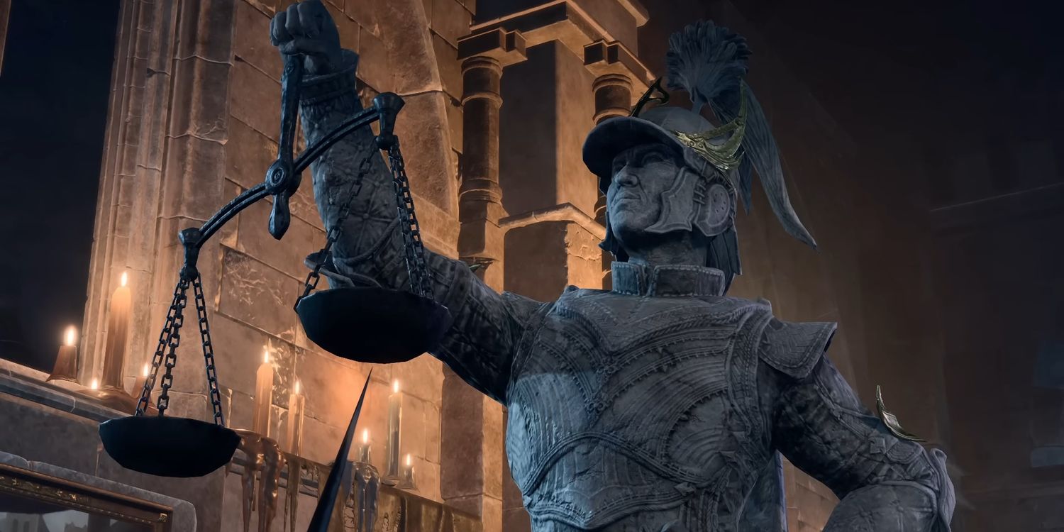 Los desafíos son, esencialmente, acertijos con diferentes soluciones. Puedes resolverlos en el orden que creas conveniente. En la Cámara de Justicia tendrás que comprender la historia que cuentan las pinturas, que están envueltas bajo el efecto de una Maldición, y luego reorganizarlas para que la historia tenga sentido. La solución a esto es Casting Eliminar maldición en la pintura. más cercano a la estatua, saqueándola y luego colocándola en el pedestal vacío. Como referencia, el nombre correcto de la pintura en Puerta de Baldur 3 es La Celda.