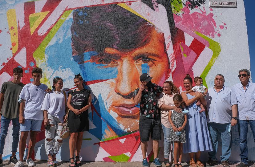 La familia de Bambino, ante el mural del grafitero Man-O-Matic que retrata al artista en el barrio de El Tinte de Utrera. En vídeo, tráiler del documental ‘Algo salvaje.