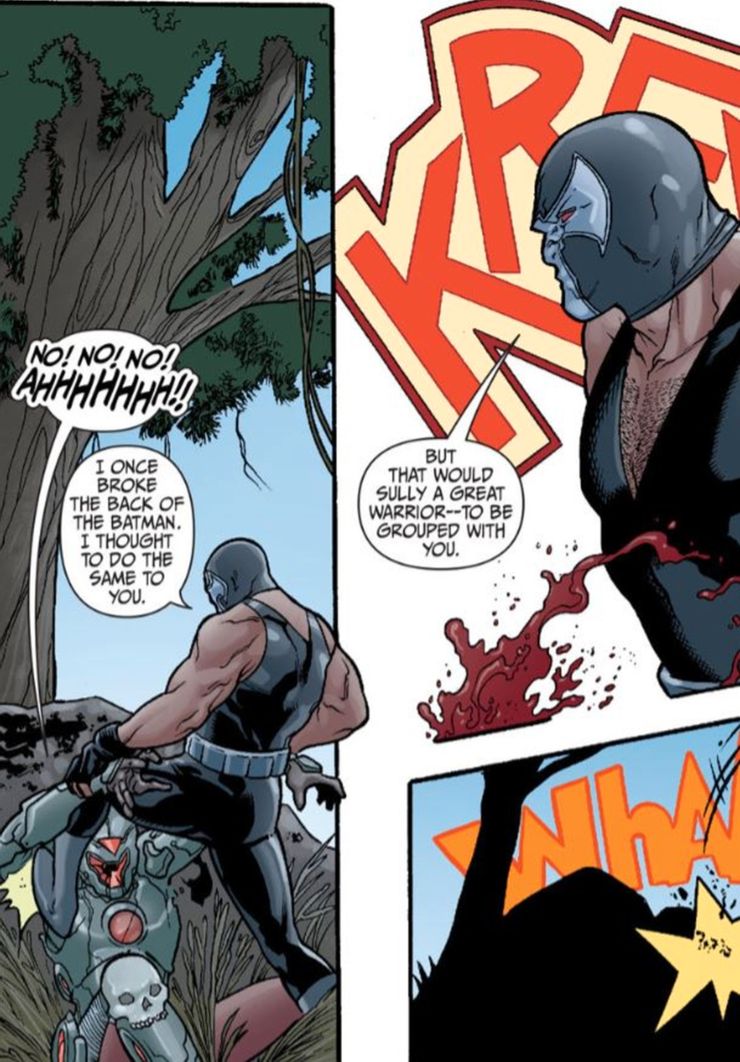En cambio, Bane simplemente le arranca los brazos al hombre y lo golpea hasta matarlo con sus propias extremidades, algo notablemente más horrible de lo que le hizo a Batman. Es interesante ver cómo Bane caracteriza su ataque más notable, ya que generalmente se usa como ejemplo de cuán peligroso es el villano. En cambio, lo trata como una insignia de honor otorgada a su enemigo más digno.