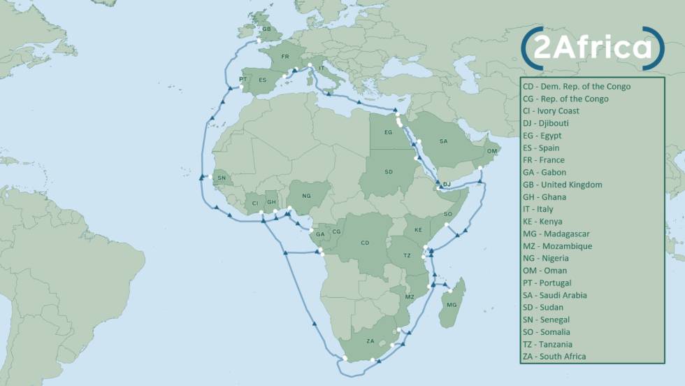 2Africa serà, amb 37.000 quilòmetres, el segon més llarg del món. Farà la volta a tot el continent africà amb 21 punts de connexió a terra. Els impulsors del projecte destaquen principalment els avantatges de la infraestructura per al continent africà. “2Africa serà un pilar clau per donar suport a la gran expansió d’internet com a part de l’economia digital emergent a l’Àfrica”, destaca el vicepresident d’Enginyeria de Xarxes de Facebook, Najam Ahmad. El Govern exposa que els grans d’internet aposten per aquests cables perquè els principals proveïdors de continguts com Google, Facebook o Netflix s’estan expandint per l’Orient Mitjà, l’Àfrica i Àsia i generen un trànsit creixent als països que estan connectats amb els CPD d’Europa.