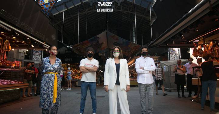 Arriba la comitiva del govern de la ciutat per saludar l’equip: l’alcaldessa Ada Colau i el primer tinent d’alcalde, Jaume Collboni. Estan més nerviosos els membres de seguretat del programa que els de la Guàrdia Urbana, acostumats a bregar amb situacions més complicades. Foto i tumult de càmeres a la porta del mercat més famós de la ciutat.