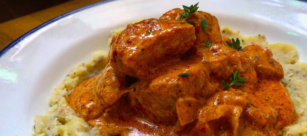 Estofado de pavo en salsa cremosa de tomate + calabaza y cebollas asadas con comino y canela + arroz integral