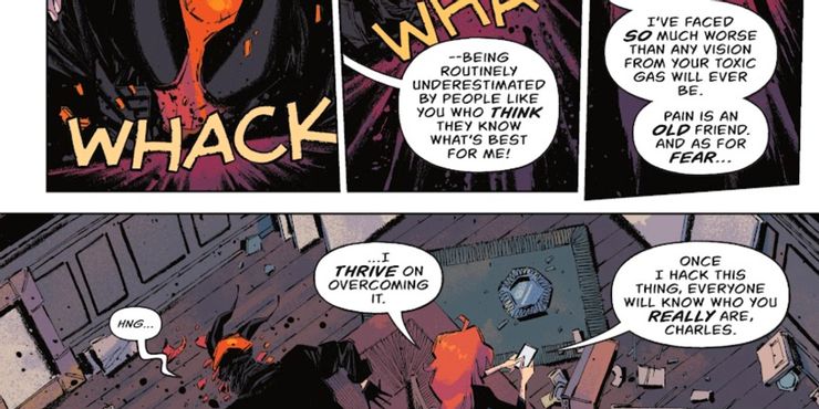 En Batichicas #6 por Becky Cloonan, Michael W. Conrad, Jorge Corona y Sarah Stern, Barbara Gordon ha sido capturada por un villano recientemente rediseñado: Spellbinder, un artista con una inclinación por el control mental. Sin embargo, cuando intenta someter a Barbara con su cepa especial de toxina del miedo, no sucede nada. En lugar de revelar sus mayores temores, Bárbara lo derriba sin esfuerzo y responde: “Me he enfrentado a cosas mucho peores que cualquier visión de tu gas tóxico… y en cuanto al miedo, disfruto superándolo”.