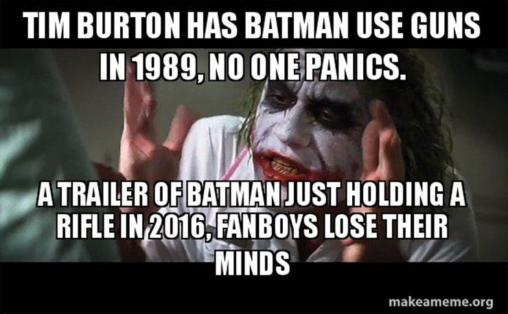En su mayor parte, Batman nunca usa un arma porque se usó un arma para matar a sus padres, y cuando se estrenó un tráiler de Batman V Superman: El origen de la justicia en 2016, que mostraba a Batman sosteniendo un rifle (que resultó dispararle a un rastreador), los fanáticos expresaron colectivamente su descontento, completando el olvido de otras veces que Batman usó un arma.
