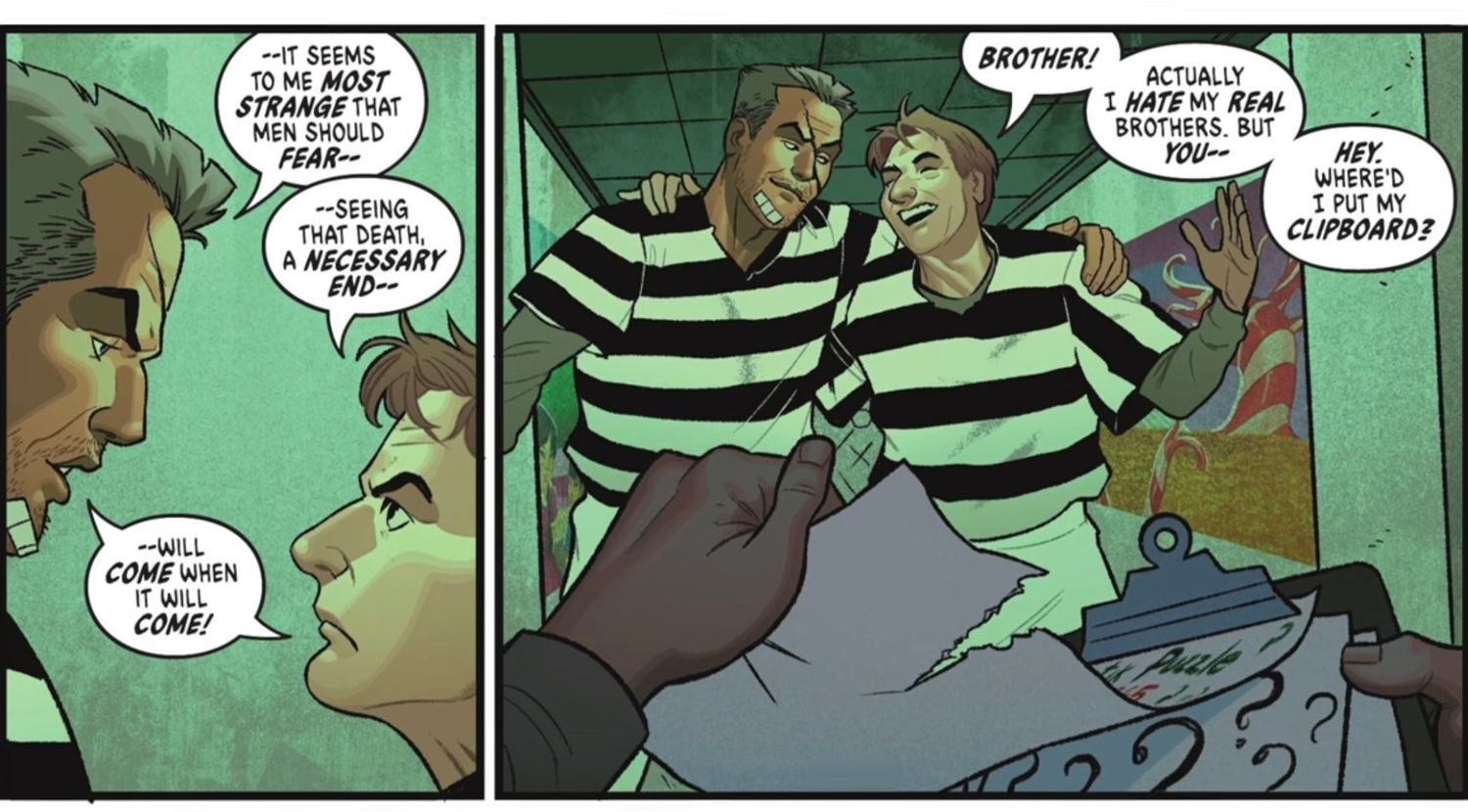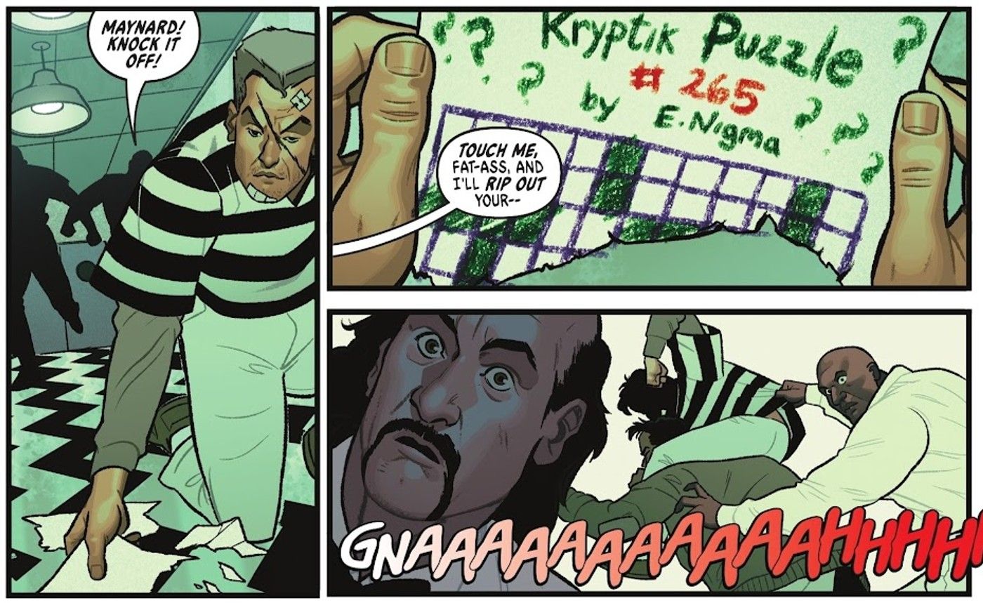 Los lectores pueden reconocer fácilmente a Short como Maynard, pero es posible que no puedan darse cuenta de inmediato de que es el Acertijo debido al cambio de nombre. Cuando se topa con Bruce Wayne en los pasillos de Arkham, entablan una conversación amistosa hasta que el doble de Short descubre que otro paciente está jugueteando con su portapapeles. Rompecabezas, signos de interrogación y El nombre E. Nigma garabateado en las páginas del portapapeles revela la verdadera identidad de Maynard.. Aunque solo aparece brevemente, es posible que se revele más sobre este nuevo Acertijo a medida que avanza la serie.