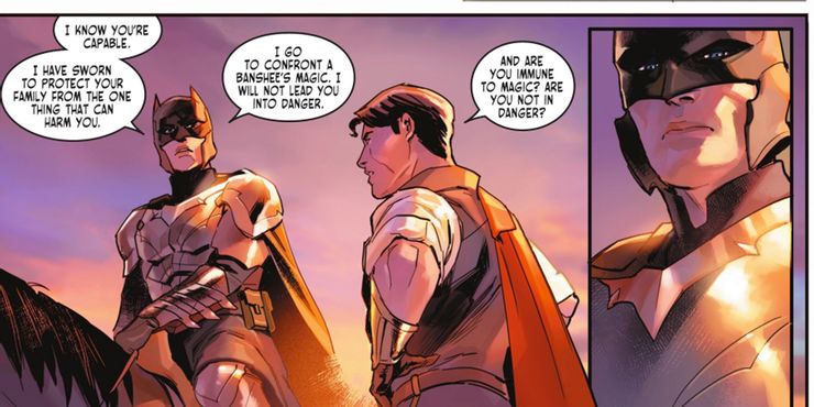 Hablamos con Tom Taylor sobre el papel de Batman y la relación con Superman en el Caballeros Oscuros de Acero. Dijo que los dos héroes son “cercanos” pero que el trabajo de Batman es protegerlo a toda costa. Taylor dijo que Bruce Wayne “es un brujo; su trabajo es erradicar la magia en este mundo, porque la magia es lo único que puede dañar a Superman, y se toma ese trabajo muy en serio”. Los lectores ven cuán comprometido está Batman en detener las amenazas mágicas, ya que casi le destrozan los tímpanos por el grito sónico de Black Canary. Pero para Bruce Wayne, está deteniendo otra amenaza potencial para su casa, por lo que el dolor vale la pena.