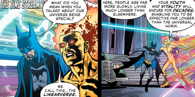 Durante esta discusión, Waverider también señala que todos provienen del “más singular de los universos, donde el tiempo pasa de manera un poco diferente … donde las personas envejecen de manera diferente. Casi imperceptiblemente “. Si bien esta declaración es mayormente ignorada por los otros héroes, Batman decide preguntar un poco más cuando Waverider lo devuelve a 1939. Waverider describe el Universo DC como un “Linearverse”, uno que da a sus residentes una vida útil mucho más larga. Luego le dice a Batman: “Tu juventud y vitalidad perdurarán durante décadas, lo que te permitirá ser efectivo por mucho más tiempo que la norma universal”. Con eso, el viajero del tiempo se separa del Caballero Oscuro.