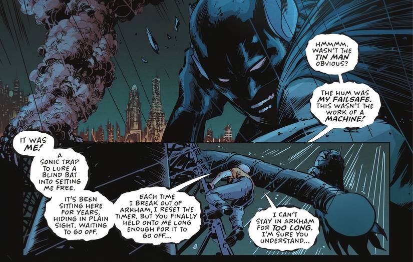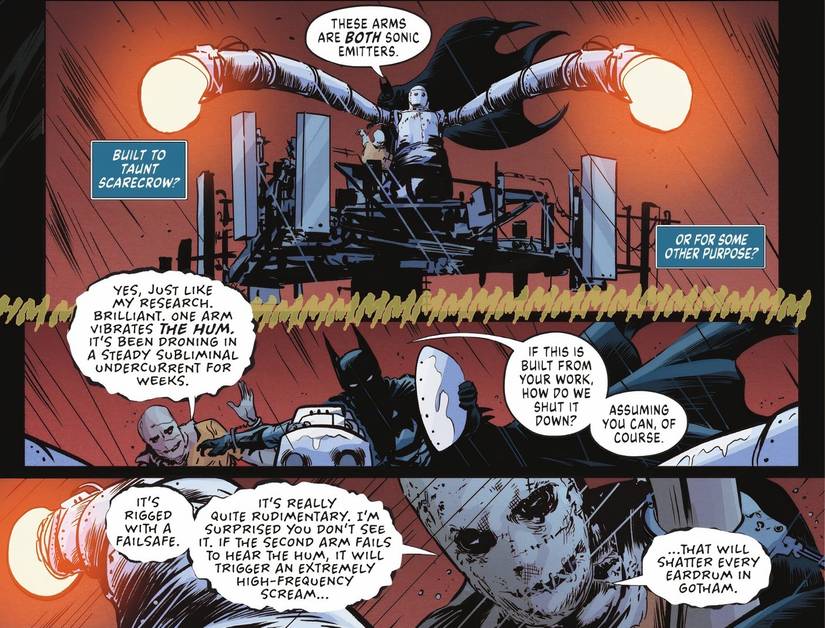 Como maestro del miedo, Espantapájaros seguramente sabría cómo salvar la ciudad. Batman y Scarecrow rastrean el zumbido hasta una máquina gigante de Tin-Man en lo alto de un rascacielos de Gotham, y los dos trabajan juntos para desmantelar el dispositivo. Sin embargo, Batman tiene una sorprendente revelación sobre quien puso todo esto en marcha desde el principio: el propio Jonathan Crane.
