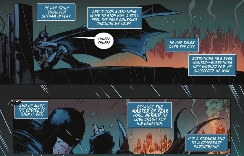 Batman admite que, inequívocamente, ganó Espantapájaros. Usando su propio invento, volvió loca a la mayoría de Gotham City, incluida la Bat-Familia. Gotham está en ruinas, ardiendo en el fondo, mientras Batman admite que Scarecrow consiguió todo lo que quería. El Espantapájaros detiene al Hombre de Hojalata sólo porque quiere ser reconocido como su creador. Si a Scarecrow no le importara atribuirse el mérito, es difícil imaginar que Batman alguna vez hubiera encontrado la fuente del zumbido. Varios villanos han vencido a Batman en el pasado, pero pocos lo hicieron tan completamente como Scarecrow.