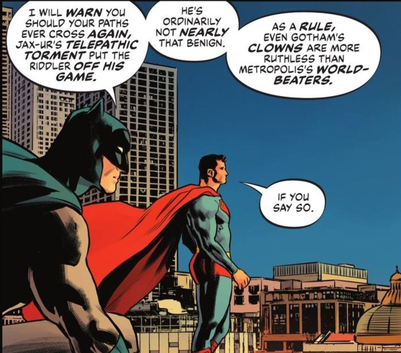 “/> Batman y Superman se unen para derrotar a Jax-Ur y enfrentarlo en la Fortaleza de la Soledad de Superman. El dúo logra engañar a Jax-Ur para que vuelva al patrón, asegurándolo una vez más en la Zona Fantasma. Los héroes también atrapan al Acertijo y lo dejan inmovilizado para las autoridades. Con el evento detrás de ellos, Superman discute el caso con Batman. Batman advierte a su amigo que la manipulación de Jax-Ur sacó al Acertijo de su juego y que, en su máxima capacidad, el villano podría ser un verdadero desafío para alguien como Superman.