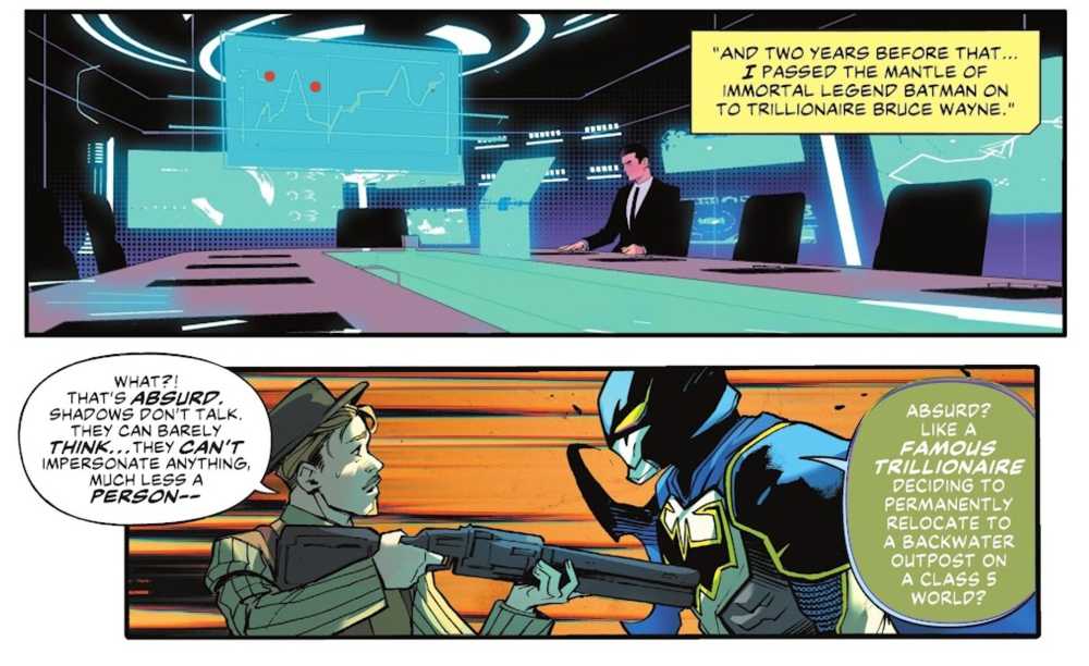 En esta realidad, Batman tiene un batsuit casi mágico impulsado por el “energía de unión” Eso conecta los reinos normales y de sombra. También tiene su propio barco interestelar que está usando para buscar la galaxia en busca de villanía, aparentemente abandonado su papel en la tierra. Como siempre, el dinero de Bruce Wayne está luchando contra el crimen donde sea que lo encuentre, pero ahora su fortuna lo ha convertido en un héroe a escala de galaxias.