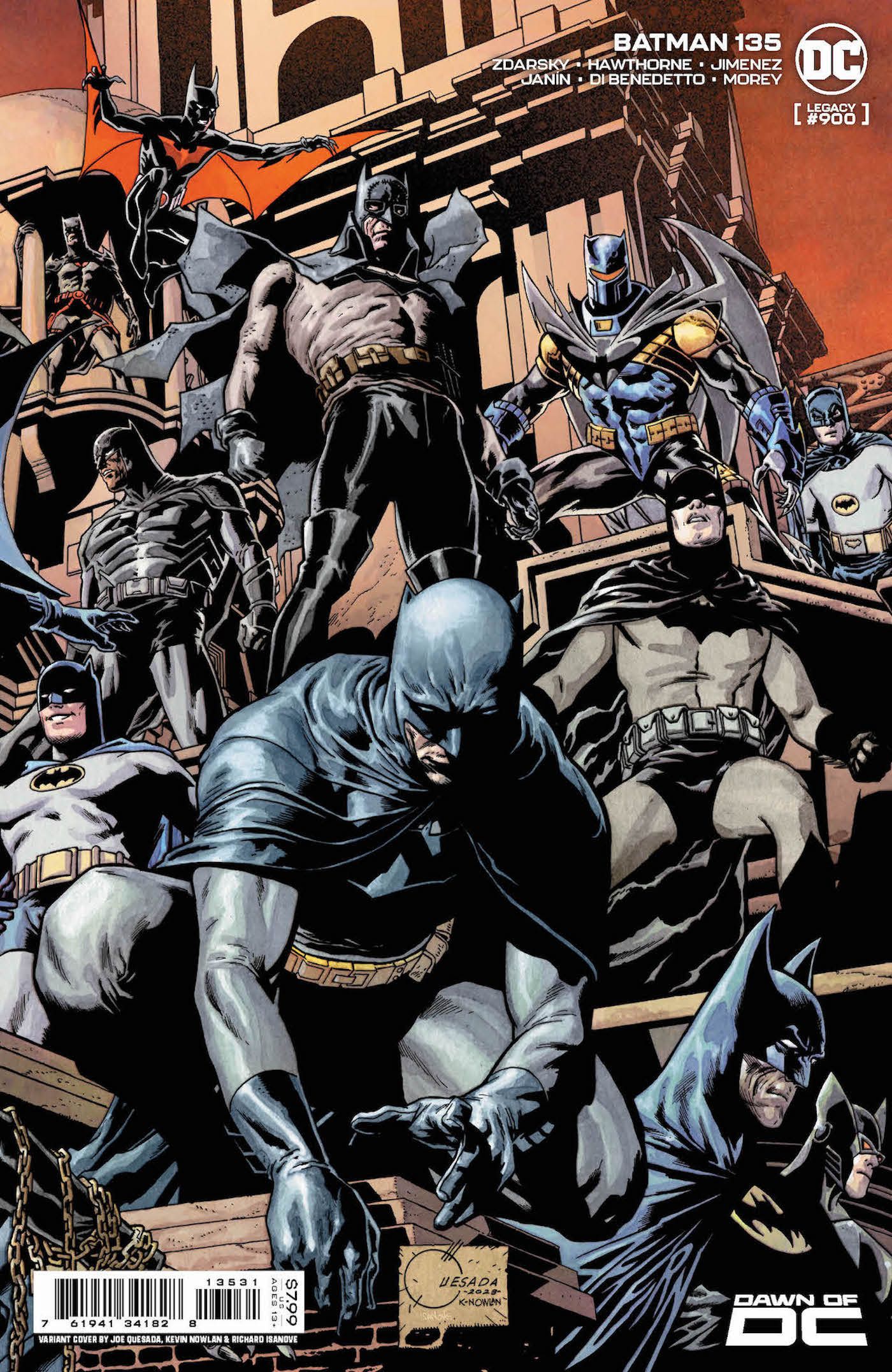 Según lo informado por AIPT, May’s ordenanza #135 se enviará con múltiples portadas, incluidas dos portadas entrelazadas de Joe Quesada, con un ejército de Batman de todo el multiverso; una de las primeras asignaciones de DC de Quesada en muchos años. El número en sí estará escrito por el escritor habitual Chip Zdarsky y dibujado por Jorge Jiménez, Mike Hawthorne y Mikel Janín. Esta historia tiene a Bruce Wayne lanzado a través del multiverso, tratando de detener a Red Mask, quien ha descubierto que tiene un propósito mucho más grande y cósmico. Dado que la historia se refiere al multiverso, es apropiado que la portada de este histórico número 900 presente un grupo de Batman. Entre ellos se encuentran Batman de Adam West, Batman Beyond, el Punto de inflamabilidad Batman, Red Death, Batman Who Laughs y Bat-Mite.