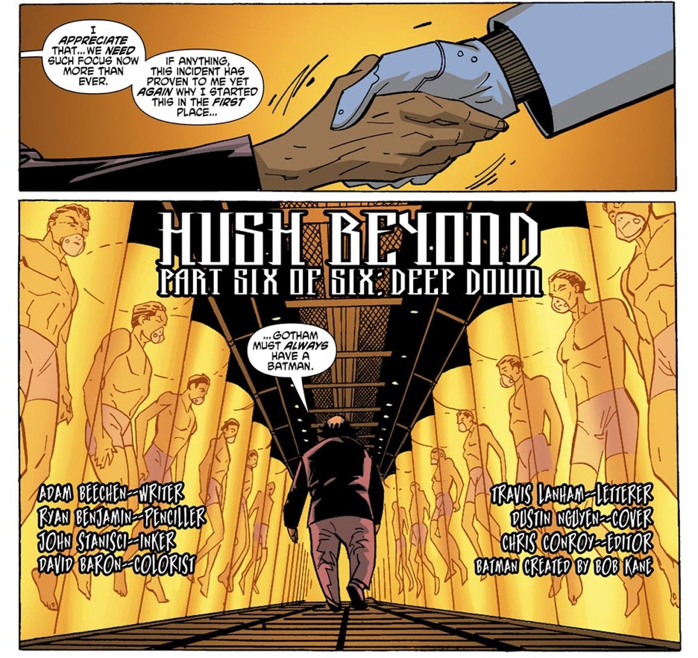 El problema con los programas de clonación es que, sin el entrenamiento y el adoctrinamiento adecuados, los clones siempre son susceptibles de desarrollar libre albedrío y elegir sus propios caminos. En el caso del ejército de clones Nightwing de Waller, un clon escapa y usa su conocimiento retenido de Batman y Nightwing para causar estragos masivos en Neo-Gotham, como el nuevo Hush. Es interesante ver cómo se desarrolla y contempla el tema del legado de Batman en los tres títulos. En la línea de tiempo principal de DC, Bruce Wayne se da cuenta de que otros son completamente capaces de proteger a Ciudad Gótica y mantener su estilo de vigilantismo de superhéroes, incluso si lo hacen de una manera personal para ellos.