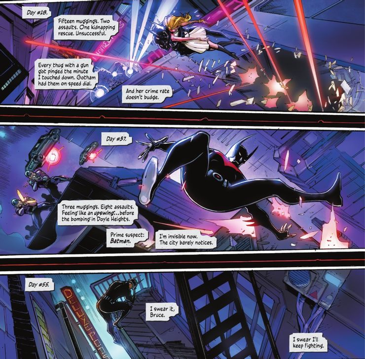 Perder a Bruce combinado con su condición de fugitivo coloca al futuro Batman en un espacio nuevo e importante que es increíblemente intrigante. Terry no solo se enfrenta al desafío único de ser su propio Batman más allá de los ideales de Bruce Wayne, sino que intenta hacerlo mientras intenta salvar una ciudad que trabaja activamente en su contra. Neo-Gotham tiene control sobre todos sus propios sistemas e infraestructuras, incluidas las autoridades y los bancos. El poder que ejerce es la definición de ilimitado, mientras que Batman está absolutamente en el punto de partida, sin tener el apoyo o las herramientas que tenía en la serie animada.