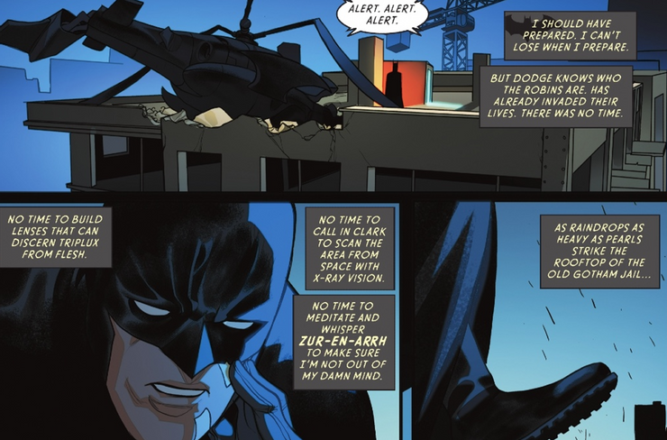 Deduciendo demasiado tarde que un viejo enemigo, Cormac Dodge, también conocido como el Artista del escape, se ha estado metiendo con la batifamilia extendida de Batman desatando a Jenny Wren sobre ellos y engañando sus mentes con un tipo patentado de tecnología de realidad virtual que él inventó, Batman lucha para encontrar una manera de superar este último problema con la facilidad que suele mostrar en momentos como este. Volando a Ciudad Gótica para frustrar los nefastos planes del Artista del escape, Batman continúa confirmando que una teoría popular de los fanáticos sobre su preparación ahora es oficialmente el canon de DC Comics.