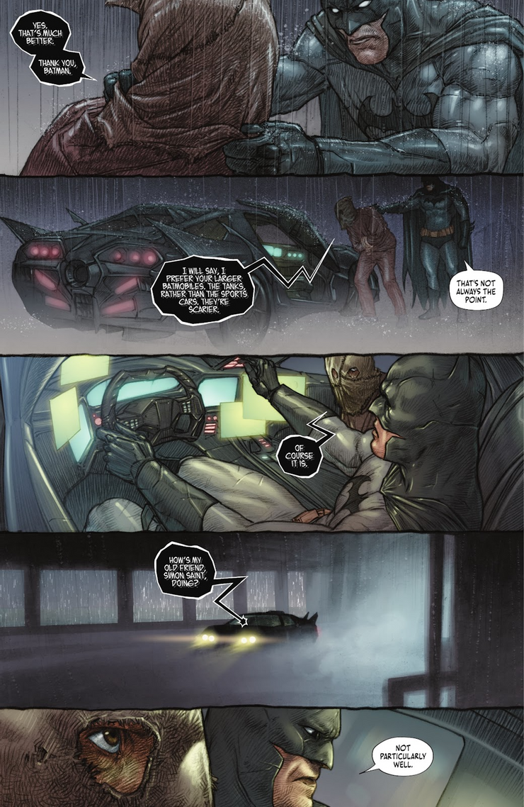 En Batman Fear State: Omega # 1, Jonathan Crane, también conocido como el Espantapájaros, es capturado por Batman y debe viajar en el Batimóvil de camino a la estación. Crane parece bastante decepcionado cuando ve el último vehículo de Batman. “Diré que prefiero tus batimóviles más grandes. Los tanques, en lugar de los autos deportivos. Son más aterradores”. Batman responde “Ese no es siempre el punto” mientras empuja a Crane dentro del asiento del pasajero. Si bien el Espantapájaros obviamente preferiría un vehículo de aspecto más aterrador, Batman está en lo cierto.