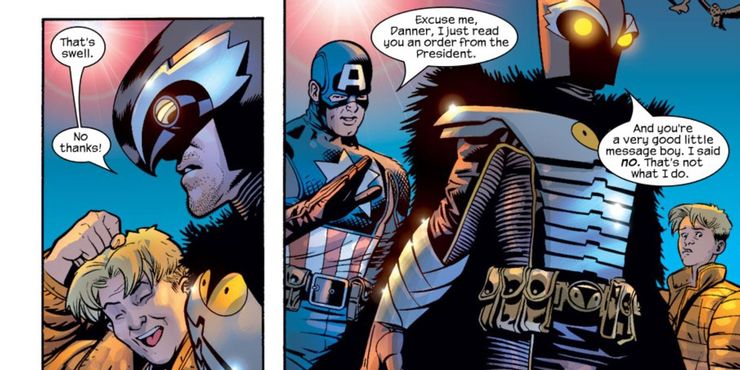 Incluso los Vengadores notan la mala decisión de atacar al Capitán América. Una vez que las cosas se calman (y se intercambian los henificadores), la versión de Alfred Pennyworth de Hawk-Owl hace que rechace la oferta sin insultar al superequipo. Por supuesto, Hawk-Owl no puede evitar llamar al Capitán América un “imbécil testarudo de primera clase” antes de partir.