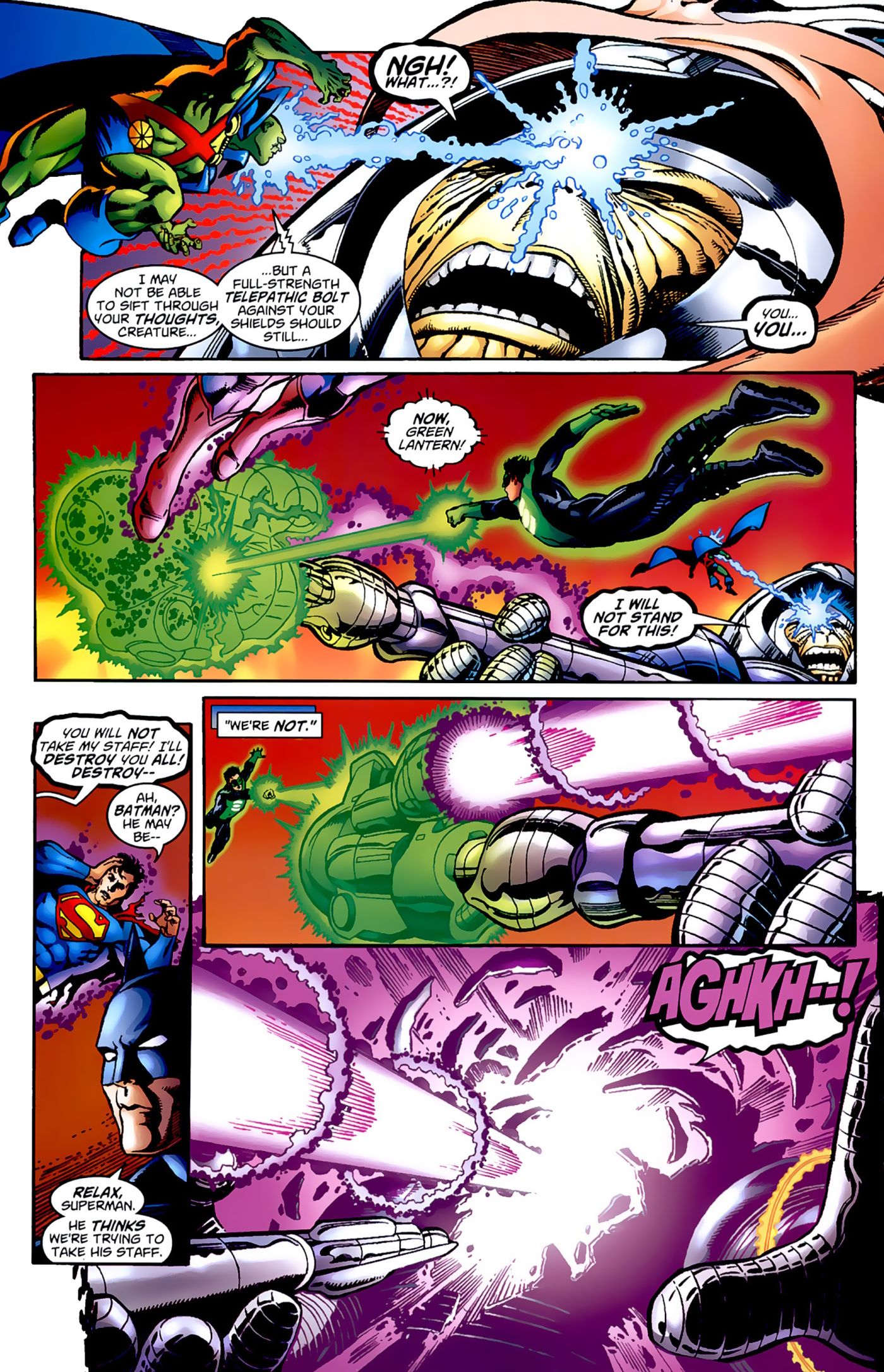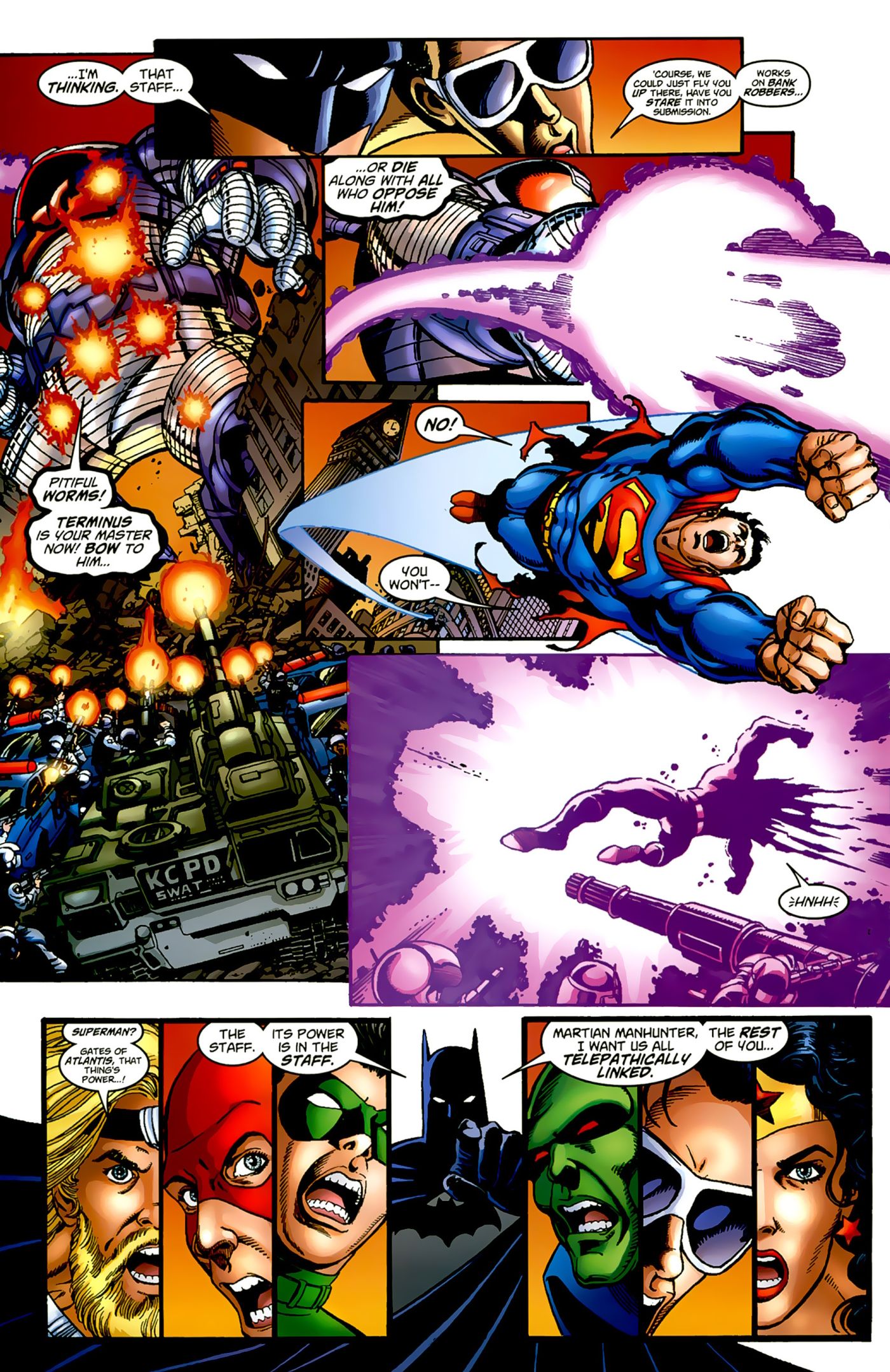 Mientras Terminus domina a la Liga, Batman simplemente observa hasta que descubre un plan. Utilizando un enlace telepático proporcionado por Martian Manhunter, Batman dirige a sus compañeros de equipo y manipula a Terminus al mismo tiempo. Batman engaña a Terminus haciéndole creer que la Liga está tratando de quitarle el cetro cuando, en realidad, están redirigiendo la energía del cetro hacia él. Gracias a la mente táctica de Batman, ayuda a derribar a un oponente que habría podido matar a Batman solo en unos segundos.