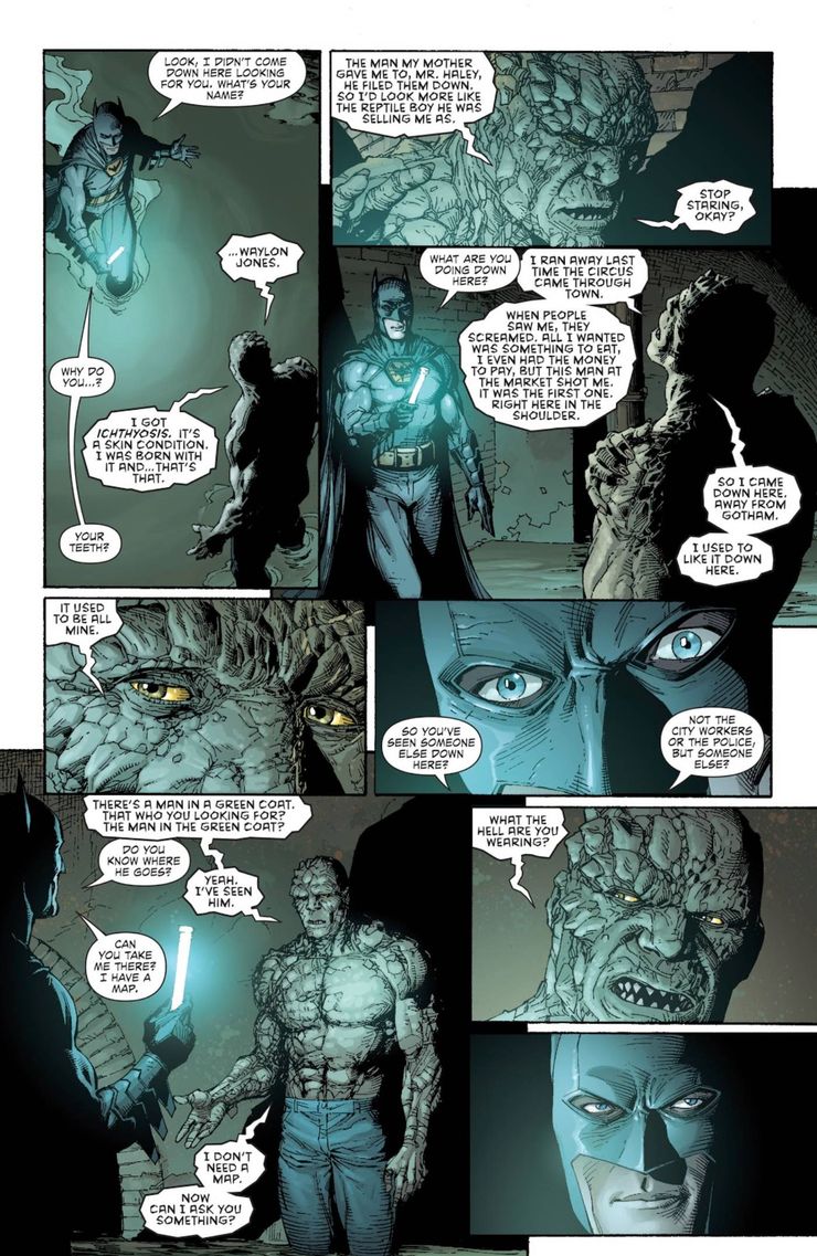 A lo largo del primer acto de la novela gráfica, Killer Croc es objeto de burlas como una presencia misteriosa y aterradora que vive debajo de Gotham City. Cuando Batman finalmente se encuentra con la leyenda urbana, las expectativas de los lectores se subvierten, ya que se revela que Waylon Jones es un personaje bastante simpático. Inicialmente, asumiendo que Batman tenía la intención de lastimarlo, como lo han hecho otros que han vagado por las alcantarillas, Killer Croc ataca rápidamente. La pelea se desescala rápidamente cuando Waylon comienza a darse cuenta de que no es por eso que Batman vino a las alcantarillas. Mientras explica su condición de piel escamosa e irreversible, también relata al hombre que le limaba los dientes, haciéndolo parecer más un reptil.