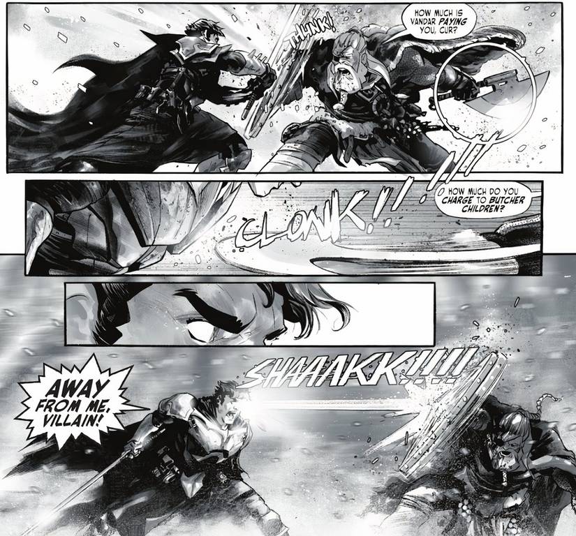 En una gran misión para entregar al joven y poderoso Alec a Gyllenhjem y detener al Allwinter titular, el dúo verdaderamente dinámico de Batman y Deathstroke debe trabajar juntos a través de tierras traicioneras. El páramo helado con los seres no-muertos en la vista previa fue una vez una tierra exuberante y colorida liderada por el Rey Maxwell I del Clan Lord, con Más detalles sobre su gobierno aparentemente se revelarán en el número. También hay algo llamado “Tormenta eterna“Tendrán que atravesar, con tormentas oscuras y fuertes en todas partes del país, como su nombre lo indica.