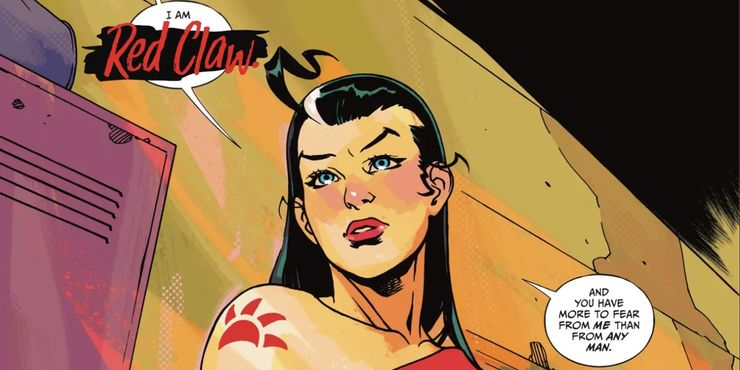 Después de aparecer en los momentos finales de Gatúbela #43, Garra Roja sale balanceándose Gatúbela #44 por Tini Howard, Bengala, Jordie Bellaire y Tom Napolitano. Red Claw, ahora oficialmente el nuevo mercenario a sueldo de DC, ha sido contratado por Black Mask para matar a Catwoman, quien afirma haber oído hablar de Red Claw, pero nunca lo conoció. El problema comienza con Selina Kyle y Harley Quinn en un Gotham Roller Derby, donde Red Claw aborda a Catwoman en el baño y luego en la pista. Después de una persecución en automóvil, el problema termina con Red Claw amenazando a un hombre que cree que es un mercenario rival contratado por Black Mask. Catwoman interviene y le dice a Red Claw “… ¿Aún no lo entiendes? Nadie lo contrató. … Es solo un asquerosoDespués de que Catwoman continúa convenciendo a Red Claw de que su empleador odia a todas las mujeres y que probablemente le pagaría más a un hombre por hacer el mismo trabajo de matar a Catwoman, la página final muestra a Catwoman, Harley Quinn y Red Claw conduciendo juntos en el mismo auto. .