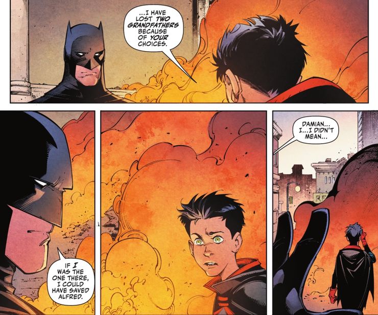 Batman es el mejor detective del mundo. No hay forma de que su comentario sobre Alfred se haya tomado bien. Damian ha sido atado por Bane y obligado a ver cómo el villano le rompía el cuello a Alfred, incapaz de salvar a uno de los pocos miembros de la familia de murciélagos que realmente lo entendía y amaba más. Batman afirma que podría haber salvado a Alfred si hubiera estado allí implica que Damian no era lo suficientemente bueno, solo sirviendo para hacer que la brecha entre el padre y el hijo sea aún más grande de lo que había sido. Si bien Robin parecía dispuesto a resolver las cosas, ya no hay forma de que esté interesado.