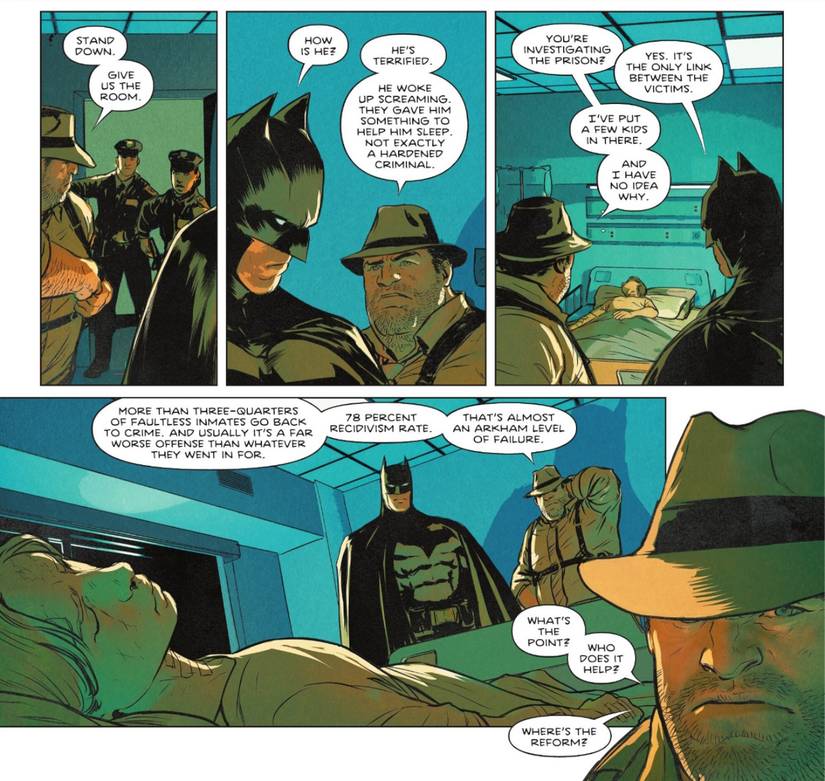 Batman ha sabido durante años que los sistemas penitenciarios de Gotham no son particularmente buenos, pero lo importante aquí es que Harvey Bullock, un detective en el GCPD, parece estar de acuerdo con Batman, que marca un cambio importante en la opinión de la fuerza policial.