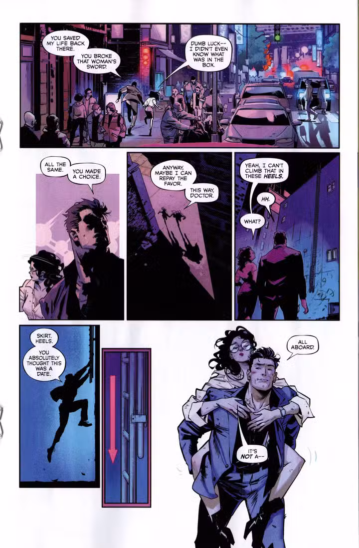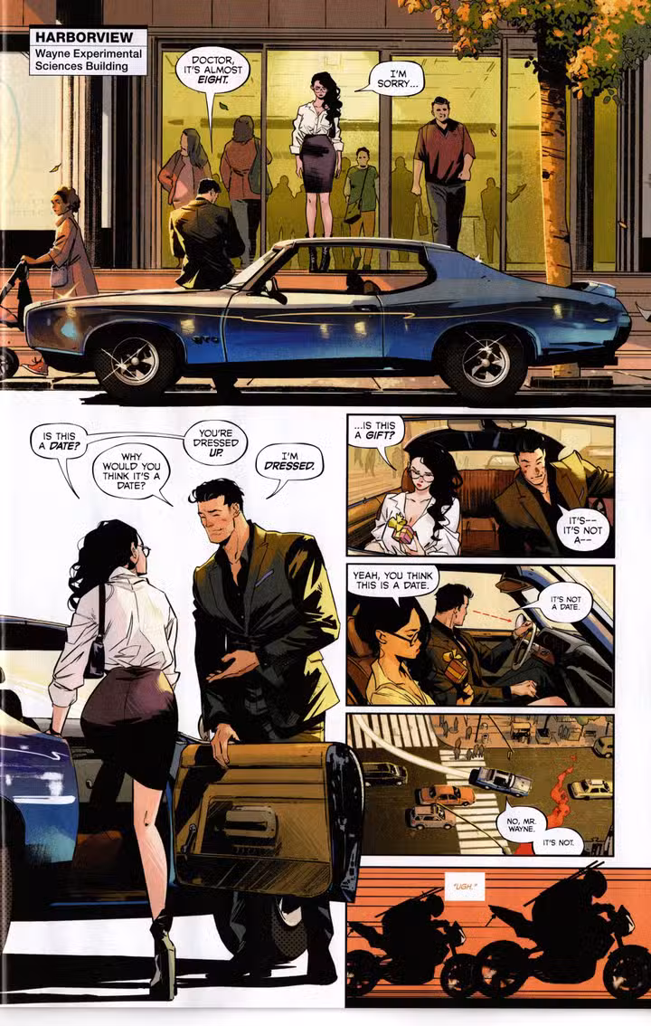 Por supuesto, este es el Universo DC, por lo que su tiempo juntos es rápidamente interrumpido por una pandilla de ninjas con katanas y una mujer que puede convertirse en una bandada de pájaros, Ōjō, quienes están haciendo todo lo posible para matar a Annika. Lo que sigue es una persecución de coches de alto riesgo y un enfrentamiento brutal con sus atacantes, durante el cual Queda claro que la química entre Annika y Bruce es sorprendentemente fuerte..