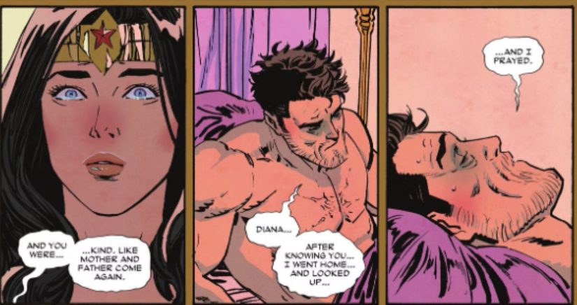 Bruce señala que no es exactamente conocida por ser un “Barrel de risas” cualquiera. Ella dispara con “Al menos sonrío”. Él responde “Clark sonríe. Brillaste”. Esa línea se siente directamente de una novela romántica. Y solo mejora. En un raro momento de vulnerabilidad, Bruce le pregunta si puede decirle a Diana un secreto y menciona su conversación anterior sobre Dios. Admite que una vez creyó, pero después de que sus padres fueron asesinados, perdió su fe. No podía entender cómo un Dios amoroso dejaría morir a dos amables y buenas personas.