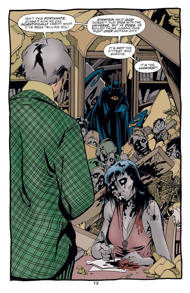 Arwin pasó de un profesor universitario moderno a llevar a Batman y a un matón al azar como rehén a punta de pistola. Arwin intenta demostrar su hipótesis sobre la suerte sobreviviente por Obligando a Batman a realizar acrobacias peligrosas en los ojos vendados. Arwin razona que si Batman simplemente tiene suerte, sobrevivirá sin problemas. Es una hipótesis ridícula, pero es todo uno puede esperar de un loco. No hay razón para asumir que Arwin era algo excepto perfectamente cuerdo antes de que golpeara el terremoto.