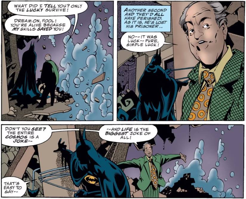 En el divagado de Arwin, termina de acuerdo completamente con el Joker, incluso si no lo sabe. Arwin comienza afirmando que solo la suerte sobrevive, pero tiene una línea extraña donde él afirma que nada en la vida importaque toda existencia es solo una gran broma. El Joker a menudo repite esta idea, e incluso se apoderó de ella bastante La broma de matar. El Joker continuamente le preguntó a Batman por qué no podía ver qué broma era la vida. Que Arwin aparentemente se volvió loco y comenzó a repetir un mantra similar no puede ser una coincidencia, especialmente dada El chiste de matar Influencia en los cómics de Batman de la era de los 90.