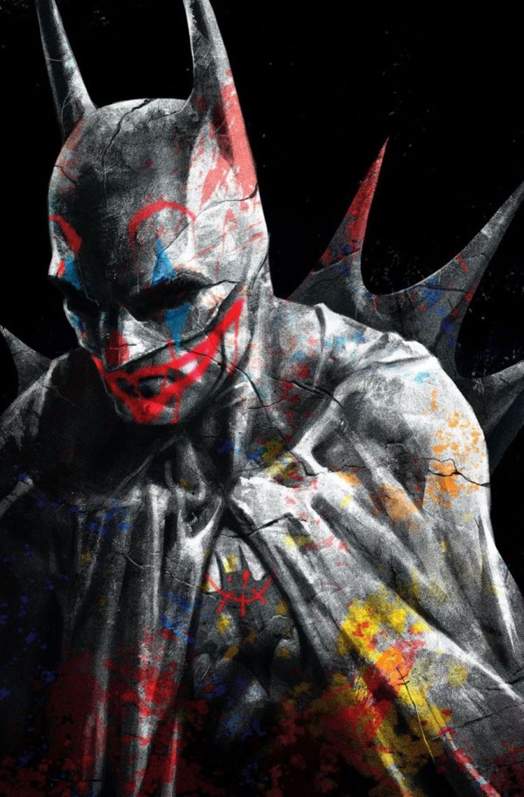 Particularmente destacable de la solicitud es la portada variante de Sebastián Fiumara para el cómic. Esta contribución es impresionante ya que muestra un aspecto sombrío. estatua del Caballero Oscuro pintada en colores brillantes, con la inclusión de maquillaje comodín que imita el del Joker de Joaquin Phoenix.