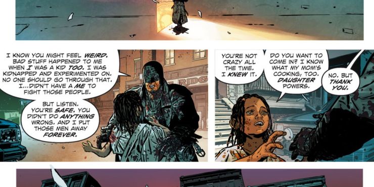 A pesar de la capacidad de violencia de Midnighter, es un personaje notablemente conmovedor, motivado por el miedo y el trauma que experimentó cuando era niño. En medianoche # 3 de Steve Orlando y Aco, Midnighter rescata a una niña y se abre camino a través de un ejército de clones para llevarla a salvo a casa. Cubierto de sangre, Midnighter es consciente de su apariencia aterradora, le dice a la niña que pasó por una experiencia horrible similar cuando era niño y le asegura que no hizo nada malo. Midnighter enmarca sus experiencias de niño diciendo: “Yo… no tenía un yo para luchar contra esa gente”, revelando sus verdaderas motivaciones como personaje: curarse de su propio pasado asegurándose de que nadie en el presente vuelva a hacerlo. tiene que experimentar lo que él pasó. Este es un paso más allá de lo que normalmente hace Batman, ya que Bruce Wayne es notoriamente hermético sobre el trauma que le dejó el asesinato de sus padres. Al hablar abiertamente sobre los efectos que su infancia tuvo en él, Midnighter se establece como un héroe más valiente que Batman.