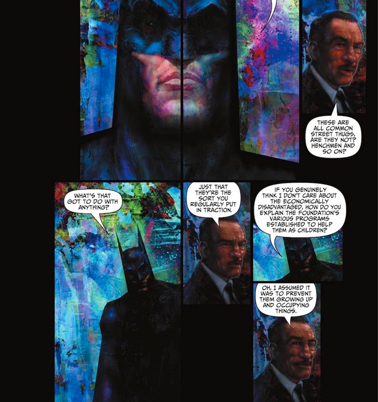 Cuando se le pregunta a Batman sobre cómo acabar con los matones callejeros, se le acusa de no preocuparse por los pobres. Sin embargo, Batman responde que ha financiado varios programas específicamente designados para ayudar a los niños de hogares de clase baja. “Si realmente cree que no me importan los económicamente desfavorecidos, ¿cómo explica los diversos programas establecidos por la fundación para ayudarlos cuando eran niños?” “Oh, asumí que era para evitar que crecieran y ocuparan cosas”. El escritor Garth Ennis había aludido previamente al hecho de que Batman es un multimillonario que lucha contra los pobres, y no rehuye el tema en Batman: reptil.
