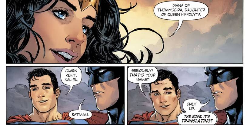 En un momento aún más duro y más veraz, Batman tuvo una reacción perfecta al Lazo de la Verdad. En “Y luego eran tres”, de 2017 Mujer Maravilla Anual #1 de Greg Rucka, Nicola Scott, Romulo Fajardo Jr. y Jodi Wynne, la primera aparición de Wonder Woman se vuelve a contar y Trinity se establece recientemente. Diana extiende el Lazo de la Verdad, y cuando cada uno de ellos lo toca, deciden revelar sus identidades secretas para que nadie pueda mentir. y Batman no se hace llamar Bruce Wayne.