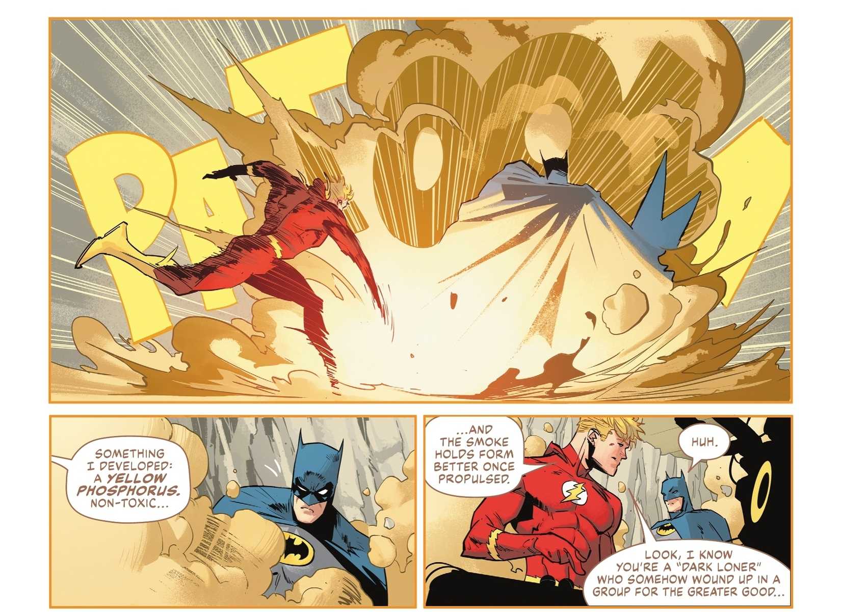 Batman recuerda tiempos mejores y recuerda cuando intentaba mejorar sus bombas de humo. Barry Allen echa una mano y le presenta a Batman un fósforo amarillo que desarrolló Flash y que mantiene el humo suspendido en el aire por mucho más tiempo. que las versiones anteriores de Bruce.
