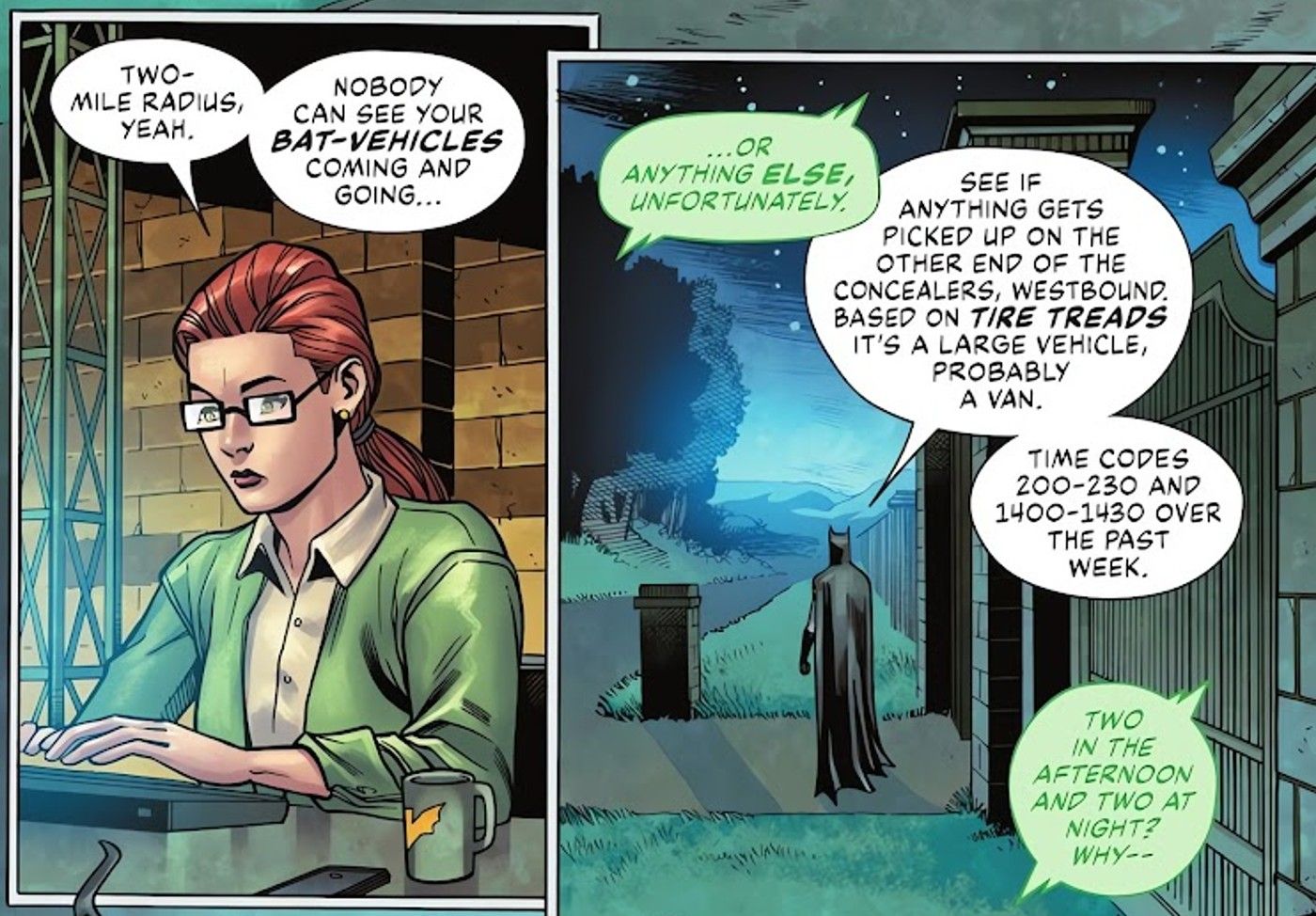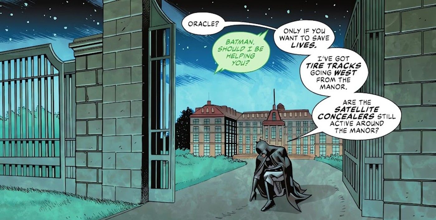En Batman/Catwoman: La Guerra de Gotham – Tierra Quemada #1 de Chip Zdarsky, Tini Howard, Nikola Čižmešija, Mike Hawthorne, Wade Von Grawbadger, Mark Morales, Romulo Fajardo Jr. y Clayton Cowles, surge una revelación crucial sobre el elusivo seguimiento de los Bat-Vehículos. Oracle revela que el misterio detrás del perfecto secreto de estos vehículos reside en ocultadores de satélites ubicados alrededor de Wayne Manor.