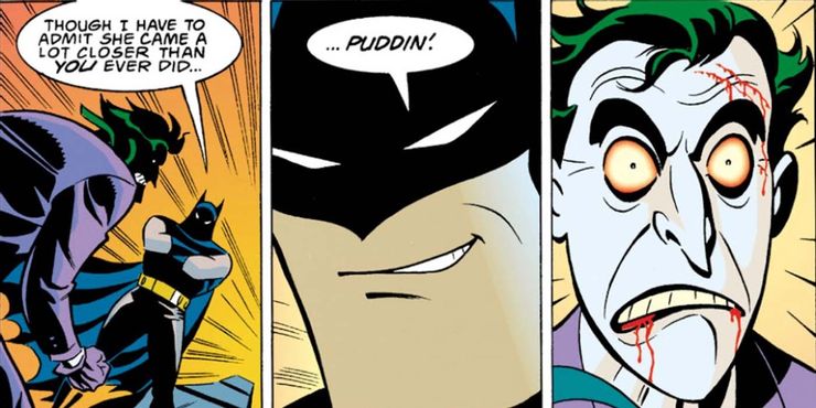 El Caballero Oscuro ha roto el bufón antes, como hombre murciélago una vez hizo que el Príncipe Payaso del Crimen perdiera el control al usar su apodo para Harley Quinn en su contra. en lo icónico Las aventuras de Batman: Amor loco, Batman llama al Joker “Puddin’” después de decirle que Harley estuvo más cerca que él de matarlo. Los comentarios y las burlas vuelven a Joker aún más loco de lo habitual, ya que no puede creer que el héroe lo haya superado.