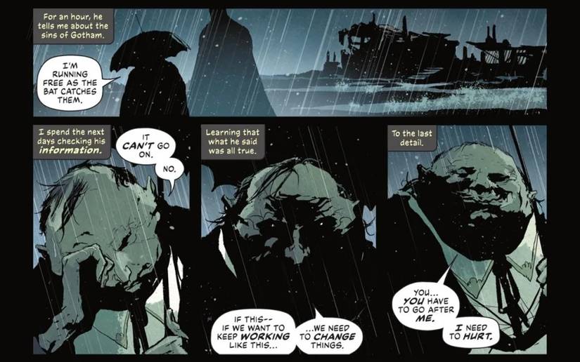 Después de ser golpeado por su socio, el Pingüino renuncia a darle más información a Batman. Batman, a su vez, le dice al Pingüino que su asociación ha terminado. Batman le dice al Pingüino que no recibirá más trato especial mientras Oswald mira fijamente a su ex socio.