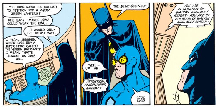 En Liga de la Justicia #2 de Keith Giffen, JM DeMatteis, Kevin Maguire y Al Gordon, Blue Beetle sugiere que Batman se convierta en un Green Lantern para salvar al resto del equipo de las odiosas travesuras de Guy Gardner. Batman responde: “[the power ring] solo se interpondría en mi camino”, a lo que Blue Beetle responde: “Sí… además, ¿quién compraría un superhéroe llamado ‘Green Batman’? Quiero decir, eso es casi tan tonto como–” “¿El escarabajo azul?”, dice Batman.